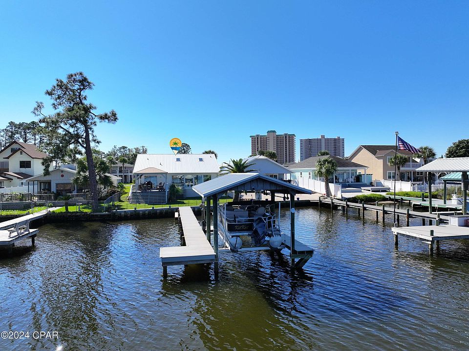 Discover your slice of paradise on the south side of Grand Lagoon with this stunning 3-bedroom waterfront home. Designed for relaxation and adventure, this home features a spacious deck with a gazebo equipped with lights and a fan, a private dock with a boat lift and wash station, and breathtaking views where dolphins occasionally swim by. The location is unbeatable with a 5-minute walk to the beach and an 8 to 10-minute boat ride to Gulf fishing. Enjoy modern upgrades like a 5-year-old metal roof, Mini Split AC in the garage, wood-look tile flooring, a beautifully lit kitchen with stainless appliances, Waterfall Quartz countertops, and built-in bookshelves in the living and guest rooms. The master suite offers private deck access and the potential for a walk-in shower upgrade. With no HOA fees, Miami-Dade standard hurricane shutters, and two kayaks included, this home is as practical as it is beautiful. Opportunities like this are rare—schedule your showing today!