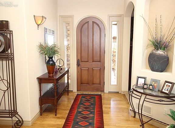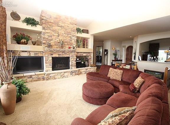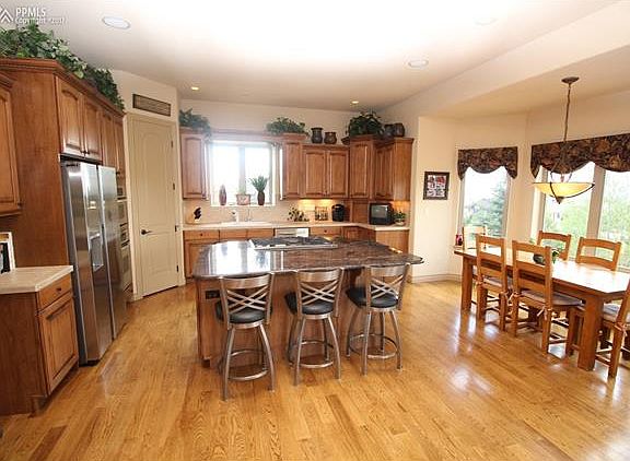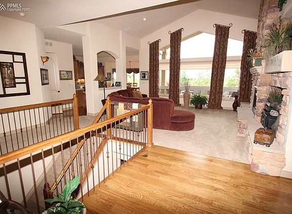 Semi custom ranch style home w/walkout basement, open floor plan, in Dist 20 on 2.59 acres convenient to Powers & Woodmen. Smoke free/Pet free one owner home, Gorgeous unobstructed Pikes Peak & mtn views, 2x6 construction w/extra insulation, vaulted ceilings, Hickory hardwood floors, granite counter tops on kitchen island, covered composite deck w/gas stub, whole house sound system. 3 gas fireplaces, built in entertainment areas, pool table area, over 50k in landscaping, full rock fireplace wall.