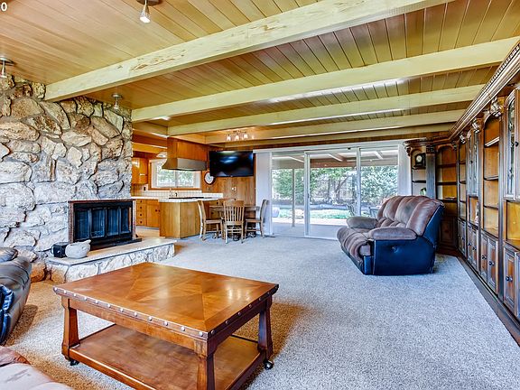 - RoomLivingRoomFeatures: Beamed Ceilings, Patio, Wall to Wall Carpet, Sliding Doors, Living Room/Dining Room Combo