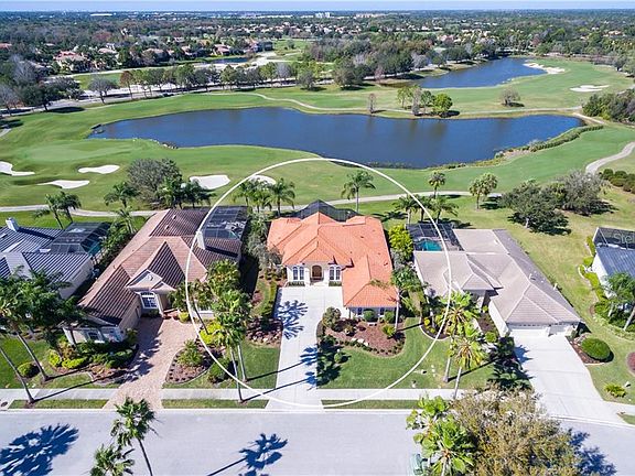 A spectacular lake view on the "signature"(#16 Cypress Links) par 3 of the Country Club is what you & your friends will enjoy in this custom built John Cannon home with a 3 car garage. Open floor plan of 2741 sq. ft. feels expansive & is ideal for entertaining. The kitchen, so complete and well planned, with generous renovated granite counters, an abundance of cabinets, center island, and walk-in pantry. The great rm, with almost 15' of sliding doors, seamlessly integrates the indoor and the outdoor entertaining spaces. Sit on the owner-added gorgeous travertine deck and relax as you listen to the waterfall features of the pool and spa and watch the most majestic sunsets. Patio area is roughed-in to receive future bar/grill/sink. Owner's suite with french doors, is light-filled and provides dual walk-in closets, private entry to lanai, dual vanities, soaking tub, & walk-in shower. Revel in the large den/study overlooking the golf course & lake with french doors, private entry to lanai, built-in desk, bookshelves, and file cabinets.The bonus second den/study, across from the formal dining room, could also be used as a sitting room. The second bath serves double duty as pool bath. Furniture package available. Lakewood Ranch finishes 2018 as the #2 selling master planned community in the U.S. according to RCLCO. Lakewood Ranch Golf & Country Club offers a private country club, 2 clubhouses, 3 private golf courses, a vibrant tennis community, an active social scene, and a greatly expanded athletic facility.