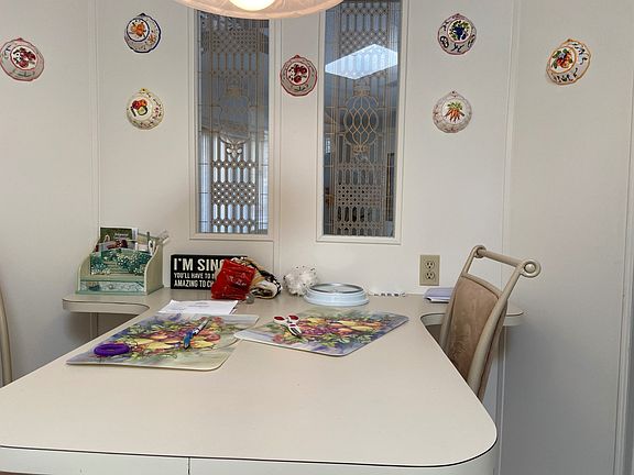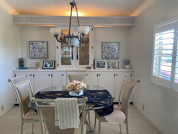 7016 Date Palm Lane, Ellenton FL. 34222 Ridgewood Estates 55+ Pet Friendly Community This home is on a rented/leased lot Come check out this light, bright 2BR/2BA mobile home with a front set lanai. The 2018 A/C keeps it all cool! The home comes partially furnished and turnkey. There is carpet and tile throughout. It also has vaulted ceilings and plantation shutters in the main living areas. The indoor washer/dryer (included in the sale) is just inside the carport entry for easy access. It also has a new driveway! The galley kitchen has 18" tile, ample storage, (w/built-ins) vaulted ceilings, a skylight and a casual eat in area. There is a formal dining area with a custom built in hutch and carpet. The living area has a custom wall with leaded glass inserts and a sliding glass door to the front set screened/vinyl lanai with 12" tile for watching the world go by. The master bedroom has carpet, vaulted ceilings, a skylight, a closet, and a master bath en suite. The master bath has 12" tile flooring, a single sink vanity with an upgraded granite countertop and a walk-in shower. The guest bedroom has carpet, vaulted ceilings, and a closet. The guest bathroom has 12" tile flooring, a skylight, a single sink vanity and a tub/shower combination. The carport can park two, maybe three cars tandem style. There is a shed on the back for extra storage. The lot rent is $841 and includes lawn mowing, edging, and blowing and the community amenities Ridgewood Estates has to offer. Ridgewood Estates is a well-maintained GATED community with 2 heated pools, a hot tub, shuffleboard & tennis courts, horseshoe pit, pool side club house with a library, fitness center & billiards room. There is also a large "event" center used for many HOA sponsored events. Cards, Bingo, Chair Volleyball, water aerobics.... just to name a few :-)