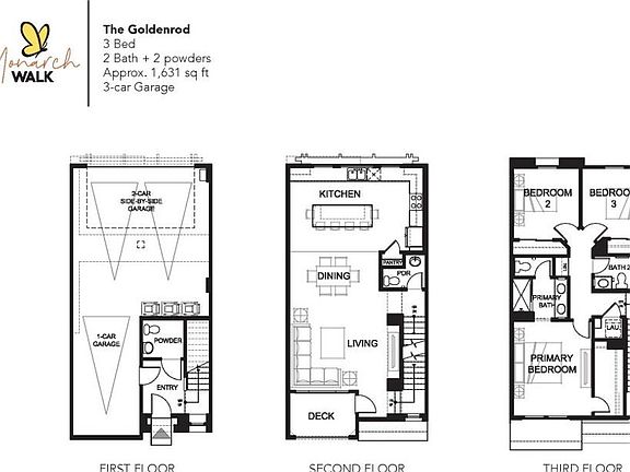 This Goldenrod floorplan features a spacious entry with powder bath, and a rare 3-car garage on the first level. When you get to the mid-level, you'll find a powder bath, and an incredibly open kitchen with oversized island. You also have a dining area, living room and deck on that main level. On the third floor you'll find your primary suite and two secondary bedrooms.