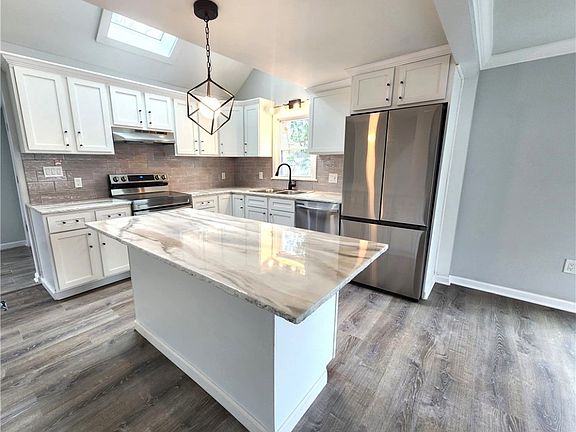 The open-concept kitchen and dining area, complete with a huge island and a vaulted ceiling with skylight, serves as the heart of the home—ideal for entertaining or relaxing with loved ones.