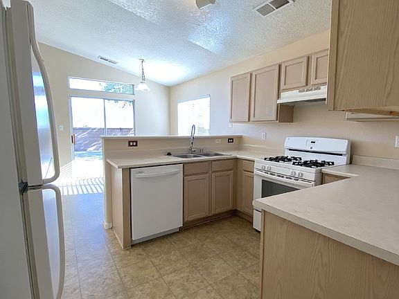 PENDING APPLICATION - Front yard landscaped. Enjoy the great backyard view of the Sandia Mountains. Living room with plant ledge, Kitchen open to dining area and mountain views. Kitchen includes refrigerator, gas stove, dishwasher, disposal, and breakfast bar. Laundry closet includes washer/dryer. 2 Spare bedrooms share a full hall bathroom, single vanity, shower/tub combo. Master bedroom has double vanity and shower tub combo. Tile/vinyl flooring (no carpet), window blinds, plant ledge, 2 car garage, evaporative cooling. NO CATS PLEASE DIRECTIONS: North on Hwy 528, L on Hwy 550, L on Santa Fe Hills, L on Bailey Way, R on Jessica Dr, L on Skylar.