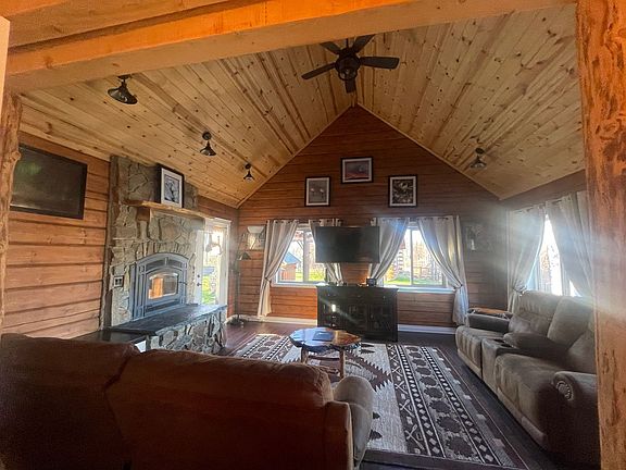 Amazing custom built Alaskan Log home right across from Rainbow Lake! 2 bedrooms, 2.5 bathrooms, Fully furnished and move in ready! Fantastic outdoor grill area and stone fireplace with gorgeous lake views! Well appointed kitchen, spacious bedrooms and custom bathrooms, soaring ceilings in the living room complete with a wood burning fireplace. Generac generator too just in case! This gorgeous home is ready for you to bring your clothes and toothbrush and move right in to call it home! Pets on approval. Available August 1