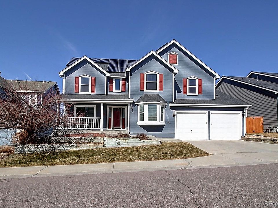 MOUNTAIN VIEW! 2-story, single-family home in Highlands Ranch offers gorgeous, unobstructed view of the Mountain Range! 3 Bedrooms +Loft and plenty of room for another bedroom in the finished walkout basement! Main level has formal Living and Dining Rooms, Great Room with vaulted ceiling and gas fireplace. Private Study with double French doors. Large eat-in Kitchen with beautiful granite-slab countertops and additional breakfast bar seating! Upper level has big Loft and 3 oversized Bedrooms. Master Bedroom offers breathtaking sunrise and sunset views with private 5-piece bathroom with walk-in closet. Finished walkout basement is ready for you to entertain friends and family, with theater screen and projector, full-sized wet bar, half bath, and room for more than one game table! Walkout basement leads to covered patio and back yard. Owned solar panels minimize your electric bill, and garage wired for electric car charging. Desirable Highlands Ranch location, just minutes to C-470 and Park Meadows. Seller willing to sell office desk, dining room furniture, and deck furniture to buyer.