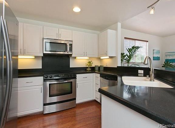 Spacious, 3-bdrm/2.5-bath, corner unit in Nanea Kai! This home features an attached 2-car enclosed garage, central a/c, double pane windows and a large, open lanai off the living room. Upgrades include cherry wood laminate flooring on the main living level, brand new carpet upstairs, stainless steel appliances and Whirlpool in master bath. Pet friendly complex with lots of guest parking. Convenient locations near Costco, restaurants and shopping. Move right in!