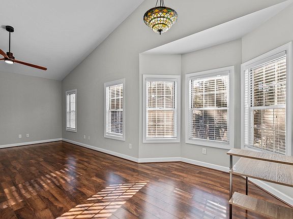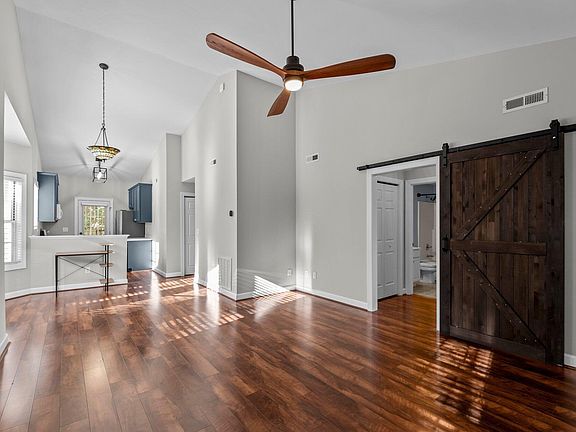 This beautiful condo is located in the heart of North Raleigh and conveniently located to shopping, dining and entertainment! Spacious open floorplan with beautiful floors through the main living areas and bedrooms. Great natural light! Recently painted walls and kitchen cabinets. The condo is on the top floor and is flanked by privacy trees with a private walk-out balcony with secondary access and extra storage. The primary bedroom is spacious and offers its own private access onto the rear balcony, a walk in closet, and large bathroom with a soaking tub, tiled shower and dual vanity. The guest bedroom and bathroom are at the front of the condo and have a sliding barn door to provide additional privacy and aesthetics. The kitchen is open to the main living areas with vaulted ceilings and has a newer refrigerator, oven and dishwasher too! Be sure to check out the community pool!