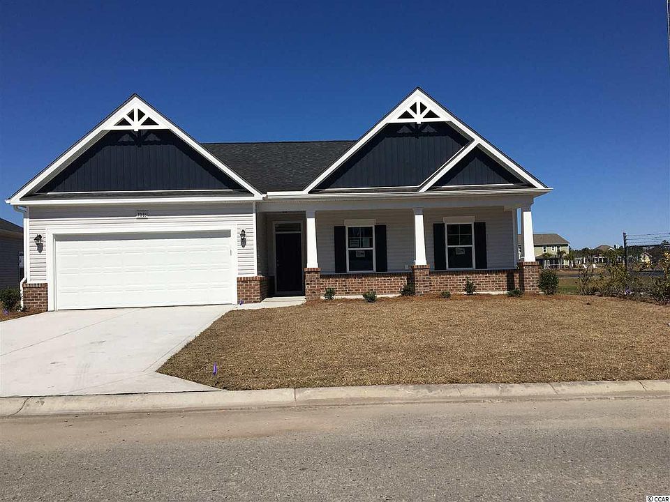 This Frisco home plan is now offered in the beautiful community of Clear Pond at Myrtle Beach National. We are centrally located in the Carolina Forest area with easy access to all Myrtle Beach has to offer. Lots of low country style with Large Front and Rear porches to enjoy your pond view. Walking distance to the completed amenity center with 2 pools, fitness, weight room, Club house and play ground. Low HOA fees. This home has 3 bedrooms and 2 baths. Our design team has added the following features to this home: Additional can lights in the kitchen and Great room. Gas line for the Frigidaire traditional gas appliance package which includes the gas range, microwave, dishwasher and garbage disposal. Granite counter tops in the kitchen with large island and pendant lights. Crown molding on the kitchen cabinets which are in a Ivory color. 5" Laminate in the foyer, hall to bedrooms, family room and kitchen/casual dining areas. Tile in the baths and laundry. A ceiling fan has also been added to the Master bedroom and Great room. The Master has a 5' shower, double sinks and large walk in closet. Master also has a trey ceiling. Picture for representation purposes only until this home is completed. Estimated completion March 2021.
