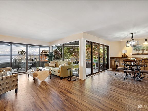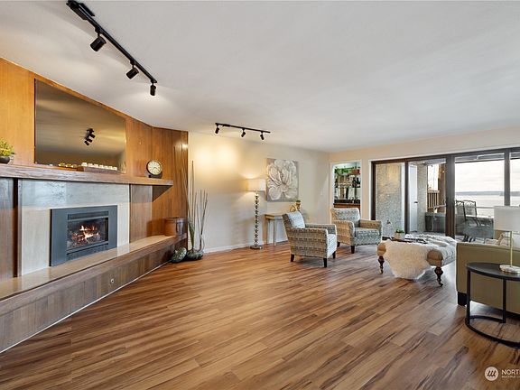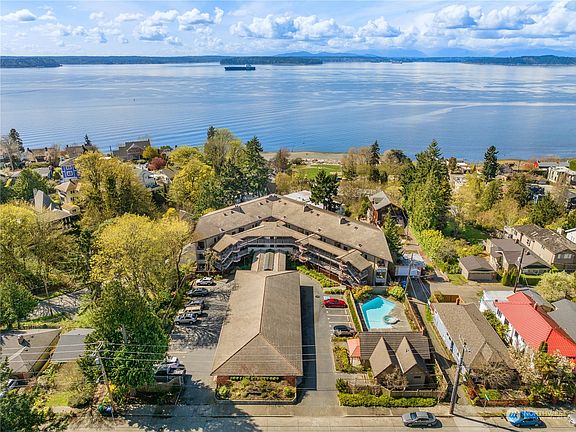 Welcome home to Seaview Terrace Condominiums! No stairs! This unit has a unique level entry, so convenient. This coveted, gated community is a hidden gem, tucked away with glorious views of the sound, sunsets & the Olympic Mountains. With 1550 s.f. of living space this open floor plan which focuses on the view is perfect for entertaining. Big main bedroom with walk in closet and a private balcony. 2nd bedroom great for office or guests. Huge entertainment space connects the kitchen w/breakfast bar, dining room, living room with a gas fireplace and wet bar. All this, just steps to the very large view deck. 2 parking spaces and 3 storage units. There is an in-ground pool, hot tub & cabana for your larger gatherings, workout room and sauna.