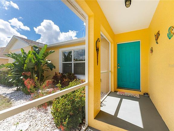 The sun is always shining on this beautiful pool home! The tropical landscaping, sunny color, and stylish exterior features create anticipation for what lies ahead. As you walk through the covered and screened entrance, views of the sparkling, heated pool and newly re-screened lanai take center stage, just past the Great Room, Dining Nook, and sliding glass doors. The ceramic tile flooring leads you throughout this home, providing easy maintenance so you will have more time to enjoy your very own private resort. Numerous windows create an energizing flow of natural light, and the well-designed split bedroom floor plan and soaring vaulted ceilings create the feel of a much larger home. The kitchen features attractive counters, ample cabinets, a breakfast bar, and it opens to the Dining Nook and Great Room, perfect for entertaining! Have coffee on your large brick paver lanai, enjoying the views of your pool as you plan your day. Centrally located, you are close to golf courses, beaches, shopping, marinas, and restaurants. If you have a project to finish, the oversized garage with a built-in workbench is the place to be. Or float in your shimmering pool that was installed in 2015 and relax the day away. Later, fire up the grill and enjoy the privacy of your backyard. The cool air, compliments of the 2018 HVAC system, is refreshing after a fun day in paradise. The whole house RO system keeps your water clean, located in an X Flood Zone, flood insurance is not required, and the hurricane shutters are icing on this cake. The upgrades and features of this home are rarely found at this price, so call today. It is time for your sun to shine!