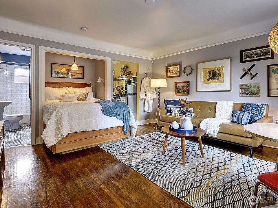 Super charming starter home or pied-à-terre. Enjoy this beautiful 1920s studio with mid-century style and hotel-like amenities. Features include a comfortable pillow-top queen-sized bed, black-out velvet drapes, a well-equipped kitchen with access to a private patio, and a full bathroom. Deeded parking spot. Surrounded by cafes, restaurants, bars & a brewery. A short stroll to PCC, Madrona Village, tennis courts & parks. You'll quickly see why it's been a successful short-term rental for 6 years. Can be available fully furnished and equipped to move right in. The small community of 8 units shares laundry facilities on the lower level. Secure storage. You'll love it here!