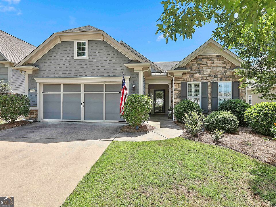 Fabulous TIFTON WALK perfectly located well within Sun City Peachtree and just a short walk to the park, softball fields and golf clubhouse. You will love the OPEN FLOOR PLAN with beautiful kitchen with newly painted kitchen cabinets, new lighting over kitchen island, walk-in pantry, tiled backsplash and granite counters. HARDWOOD FLOORS throughout the main living area and TILED kitchen floor. The living room/great room features a gas FIREPLACE. Dining room has a wall of windows overlooking the backyard. The master suite features a trey ceiling, generously sized bedroom (TV included), full en suite bath with tub and separate shower, water closet and large walk-in closet. The guest bedroom is located on the opposite side of the house and has a bathroom just outside the door. In addition to the two bedrooms, there is a flex room with French doors. Dining room leads to the custom screen porch with privacy and tranquil views of the green space in your backyard! Porch leads to large patio with Sunsetter Electric Awning that can sense if it needs to close if the wind picks up. The spacious laundry room is located just inside the garage and has a large storage closet and new washer & dryer. High-end plantation shutters throughout. The extended garage has an awesome Swisstrax floor, PLUS an extra bay, that could be used for golf cart parking, workroom, or more storage...pull down stairs in the garage leads to 8 X 20 storage. Additional access to the attic located in the laundry room. Tranquil backyard is buffered by trees and gets visits from local wildlife. IRRIGATION front and back. Sun City is a great place to live with a state of the art clubhouse/fitness center that has many clubs, movie theater, indoor walking track, indoor and outdoor pools. There are sidewalks everywhere, a dog park, tennis courts, pickle ball courts and more. All this is located behind the secure, manned gate.