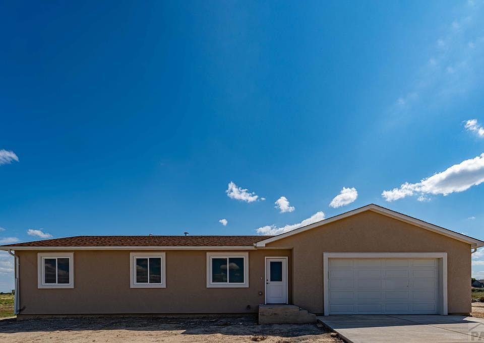 Imagine waking up each morning with wide-open skies stretching over your very own acre of land in Pueblo West. This brand-new 3-bedroom, 2-bath ranch-style home was designed for modern living, yet it sits on 1.01 acres zoned A-3—giving you the freedom to keep horses, start a small farm, grow a nursery, or simply enjoy the peace of country space. Step inside and you'll find a light-filled, single-level layout with 1,226 square feet of thoughtfully designed living space. The kitchen steals the show with gleaming granite countertops, stainless steel appliances, and a sleek backsplash that ties it all together. Smart touches—like recessed lighting, dimmer switches, and motion-sensor lights in the laundry room—bring convenience to everyday life. Durable laminate vinyl plank flooring flows seamlessly throughout, while the primary suite offers a private retreat with a walk-in closet and ensuite bath. Each bedroom is equipped with ceiling fans for comfort, and central air plus energy-efficient dual-pane windows keep the home cozy year-round. Outside, dusk-to-dawn lighting enhances both charm and security, while the oversized two-car garage provides room not only for vehicles but also for storage or a workshop. With underground electric service and modern finishes throughout, this home blends style, comfort, and functionality. Whether you dream of creating your own homestead or simply want the tranquility of open space with room to grow, this new rancher is ready to welcome you home.