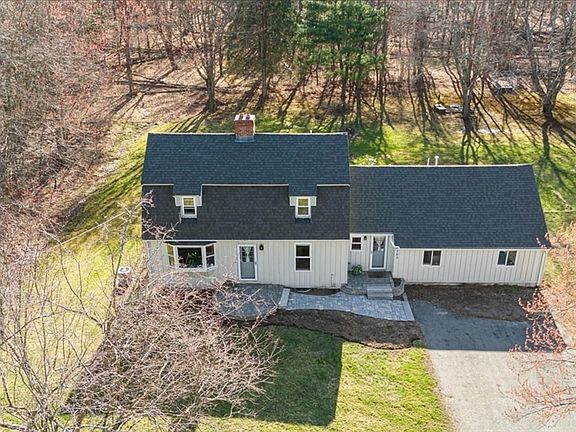 Idyllic setting and endless possibilities await you in this versatile 3 bedroom 2 bath cape. The home sits privately on 4 acres abutting conservation. Wide pine floors throughout the main living area which boasts an open floor plan offering loads of natural light through oversized windows. The kitchen has vaulted ceilings, pantry, quartz countertops, new appliances and loads of cabinet and counter space. Off the kitchen you'll find a 4 season sunroom with slider to a 23x25 deck and sunny back yard. Additionally there is an ample sized dining and living room, half bath, laundry, bedroom and office space. On the second floor is the large primary bedroom with vaulted ceilings, full tiled bath with double vanity and skylight to keep the sunlight pouring in as well as your second bedroom with access to storage. Finished basement with additional storage. Oversized heated 39x28 2 bay garage with loft storage and new garage doors. Offers are due no later than 2pm Tuesday May 6th.