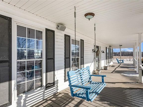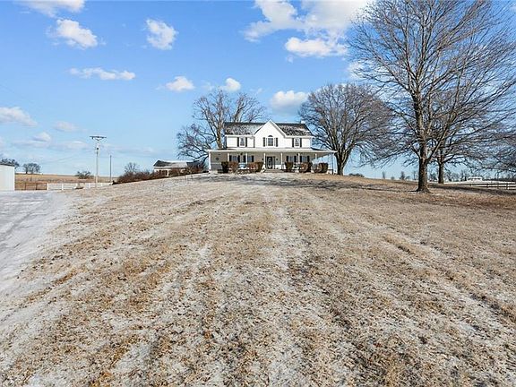 Family oasis in Platte County, Missouri! Beautiful two-story home on small acreage. Large 50 x 90 outbuilding set up with a workshop, a tack room and horse stalls. Fencing for the horses too. Lovely views from all angles on this wrap around porch where you walk into an open floor plan with family room /kitchen, office space and a formal dining space with lots of built ins that can be used as a toy room, home school or whatever fits your family's needs. Larger bedrooms and closets upstairs. The basement is finished and provides a non-conforming 5th bedroom if needed. In ground pool and brand-new roof! Come see this small piece of paradise!
