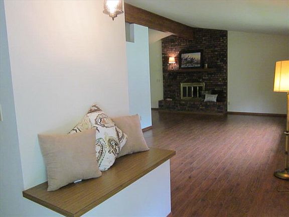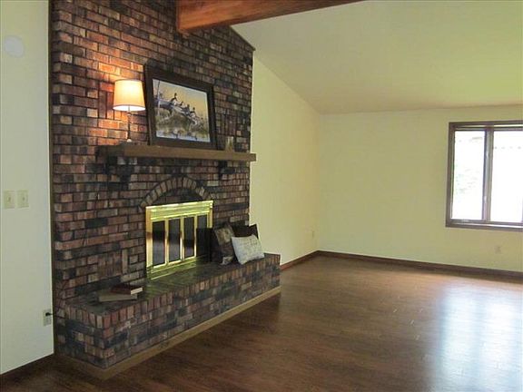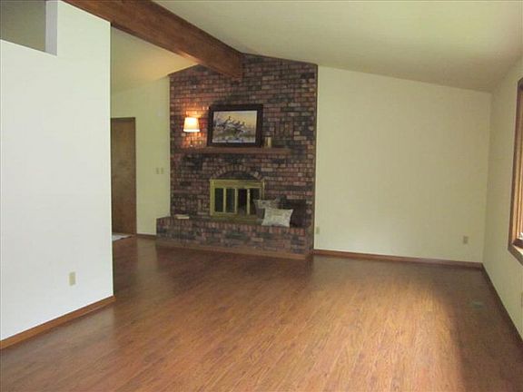 Spacious and Ready to move in ranch home with full walkout basement. This 4BR, 3BR home has 3 garages and tons of storage. The new front door welcomes you into the vaulted ceiling living space that makes up the entry, living room, dining, and eat in kitchen.(could be opened up and create a great open feel) The hall leads to 3 bedrooms, 1 full hallway bathroom, plus the master suite enjoys its own newly remodeled bathroom. The flooring has all been updated to hand scraped wood laminate and pretty stone tile. The walls are freshly painted and spaces are immaculate. The lower level has a large family room that is accented with reclaimed wood siding, partial open staircase, and a woodstove that is just below the fireplace upstairs. There is a large 4th BR, large utility room