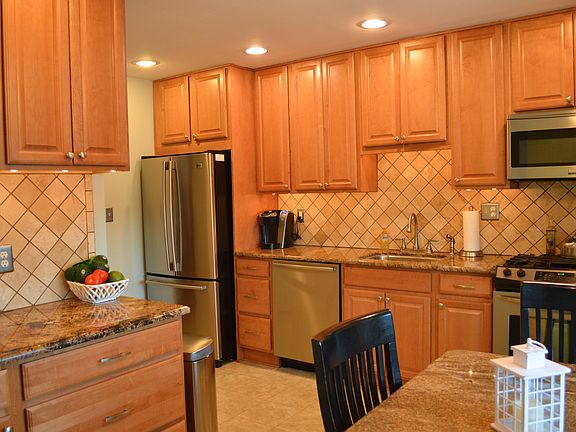 Beautifully upgraded and maintained Town Home! Eat in Kitchen with granite, 42" cabinets, and Stainless Steel Appliances. Large window over the Custom granite topped Kitchen table set - included.Living and Dining Rooms are bright and offer wood flooring and an open and spacious layout with Sliding doors leading to the deck and yard. Community playground is immediately behind the home. Anderson windows with tinted Sante Fe Glass. Both HVAC units replaced in 2010. Master bedroom is large, featuring 2 walk in closets and a remodeled full bathroom with a granite top and plank flooring. The second bedroom is also spacious with a walk in closet and a double closet. The Basement level is finished to make a Family Room with tiled flooring and an additional storage room that has the washer/dryer and utilities