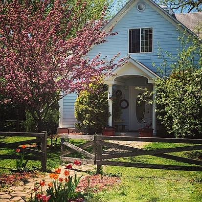 This beautifully charming home was built in 2004 with Sthapathya Veda principles. It has hard wood floors in excellent condition. Open Layout downstairs full of light. 3 Bedrooms and 2 Bathrooms. Washer and dryer conveniently located in the upstairs bathroom. The yard is easy to maintain and comes with fruit trees and garden space. In back of the house you will find a converted garage that offers a nice quiet space for an office or guest room.