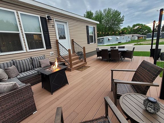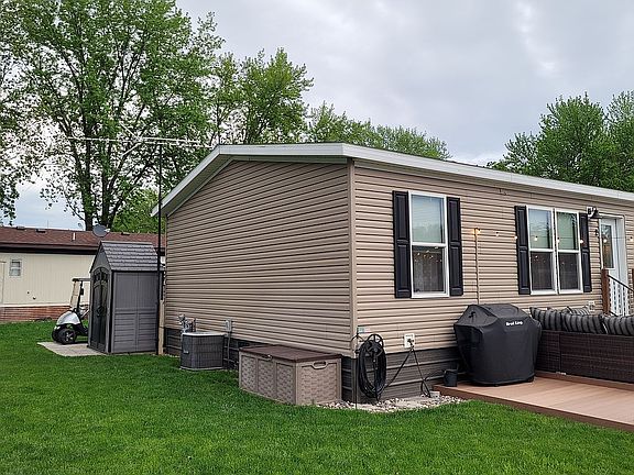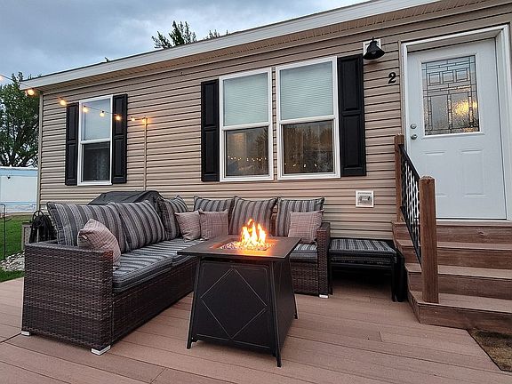 Completely maintenance free home! Move right in! Many extras included: 14'x27' maintenance free deck along with a gas grill, patio sectional couch, outdoor dinning table with 6 chairs, and gas fire pit, and outdoor lighting to enjoy your evenings with friends & family! Also included: vinyl 4'x7' storage shed and 3'x6' vinyl storage chest for your lawn games or misc outdoor items! Stainless steel appliances including: 5 burner gas range, micro hood, and frig/freezer, along with slate gray washer & dryer are all included. Driveway accommodates 2 vehicles and has new cement from street access directly to mud-room entrance into home. Stone fireplace with modern electric glass accents is lovely for ambience! The home has been secured on (26) 2' round by 4' deep cement piers for complete assurance of never settling and having structural cracks. 2 TV's, along with 2 white pantry cabinets are also included. Very clean home. No pets nor smoke in home. A must see!