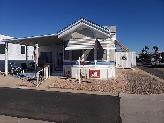 Welcome to Superstition Sunrise where the fun never sets. This corner lot home has a large AZ room with a large laundry room that can accommodate a queen size bed or make for an easy conversion to a 2nd bathroom. New roof 2021. The main home has a large bedroom with lots of closet space. In the bathroom you have a large step in shower with a seat. The walk through kitchen gives you tons of cabinet and counter space. The living area is bright and open. Come on by before this home is gone.