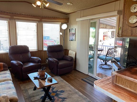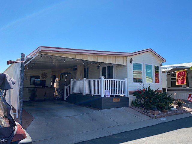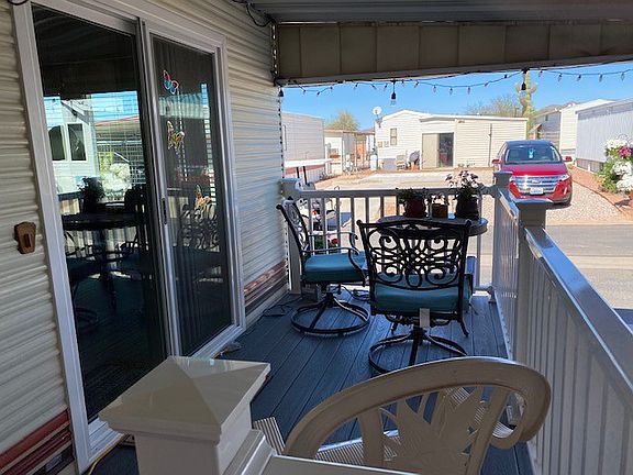 This furnished home is located in Superstition Sunrise where the fun never sets! This home is surrounded by mountain views in beautiful Apache Junction Arizona in a premiere 55+ community with almost every amenity you can imagine. The windows and door were replaced in 2021 and a deck was added the same year. The floors and sub-flooring were also replaced. The kitchen has a new stove, sink and refrigerator. The owner is offering an incentive to have a washer/dryer installed. The countertops are a beautiful epoxy finish. There is a nice size bedroom with storage and the bathroom has a walk-in shower. A bump- out awning was also installed in 2021. There is a new water softening system that is currently being rented and the contract is transferrable. This home is clean and ready for the new owner!