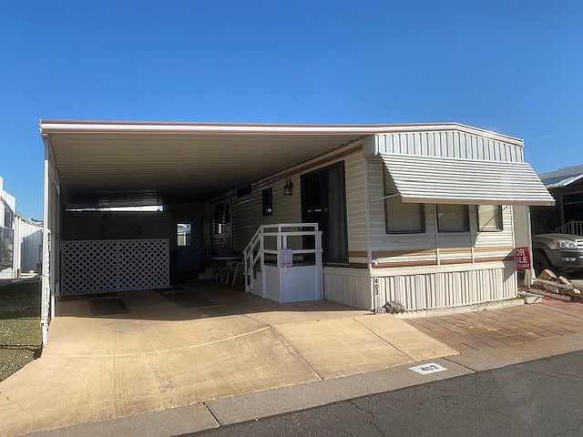 This home is located in Superstition Sunrise RV Park where the fun never sets! The park is surrounded by mountain views in beautiful Apache Junction Arizona in a premiere 55+ community with almost every amenity you can imagine. This home comes fully furnished and has lots of extra storage, both inside and outside. The full-size washer and dryer are located in the detached large shed. There is a U-shaped kitchen that opens into a nice living room area. The (2.5 ton) air-conditioning was replaced in 2017 and the plumbing was also replaced in 2021.