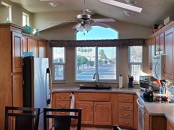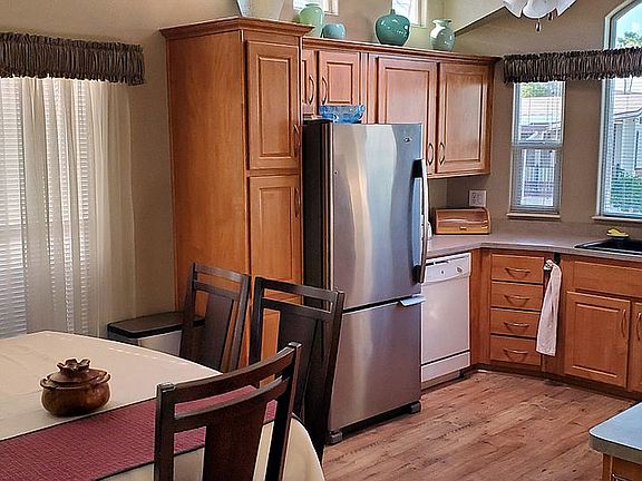 2009 Cavco Hard to find large Front Kitchen model with same level Arizona Room… easy flow open floor plan 1 Bedroom (+ sleeps 4 w/sofa bed) 1 1/2 Bathrooms Arizona room Storage/shop area with shelving. Laundry room w/shelves and storage Water softener Compact refrigerator/freezer New Ashley Genuine Leather full power reclining love seat with center console & armrest storage, with USB & wireless chargers, electronic controlled adjustable headrest & lumbar support ($2700)* Queen size sofa/sleeper with 3 inch foam mattress topper Coat closet/storage High ceilings throughout home Upgrades: New quality wood laminate flooring in kitchen and living room, porcelain tile in 1/2 bath, storage & laundry room, waterproof laminate flooring in master bath. New carpet in bedroom New 3 ton American Standard/Trane heat pump w/2 K&N lifetime filtered returns ($6890)* New Hot Water Heater New Composite oversized sink New kitchen faucet w/spray nozzle New Simple Human under sink roll-out trash can New Garbage Disposal New Stainless Steel Bottom Freezer Amana refrigerator ($999)* New under sink water filtration system New Woodbridge 1 Piece Toilet w/Bidet in master bath ($685)* New screens on windows New LG big screen TV New self-close soft-close hinges on cabinetry New motion security light on front porch/deck Optional Accessories when purchased include: Arched Kitchen Window Above cabinet windows Sky Light in bathroom Kitchen Island (on wheels) Recessed cabinets in bedroom Angled TV cabinet in dining room Full size GE dishwasher Full size above range GE hood/microwave combo 30” GE smooth top self cleaning electric range 4 ceiling fans with adjustable lights (living room, bed room dining room & kitchen) LED Cabinet Lighting in dining room Full size Walnut dining room table (seats 6, 8 with insert) ($1800)* Memory Foam Queen Mattress in bedroom TV in bedroom Large office desk with cabinets above Roll top desk Small desk in hallway LOTS of storage throughout home Composite Deck Sealed Epoxy driveway Extended covered carport 3 Large (4’ x 10’) pullout storage under home Storage shed in back Charbroil gas BBQ w/new cover This home is in a very convenient location, easy walk to everything but not so close you hear everything going on. Comes completely furnished including many extras not found in other homes. For example, all furniture, paintings, vases, bowls, plates, glasses, silverware, quality stemware, pots, pans, all linens for kitchen, bath and bed. Laundry supplies, cleaning supplies, tools, spare household parts, weed killer, car care products, etc. Storage under home includes garden hoses, yard blower, vacuum, ice chest, fishing gear, hundreds of dollars in high end Christmas decorations and figurines. Storage shed in back with yard tools. It would take more than twice the asking price to replace or duplicate this home and it’s belongings. * value when new… included in sale price of home