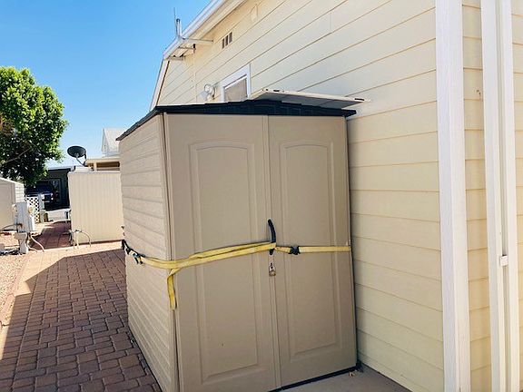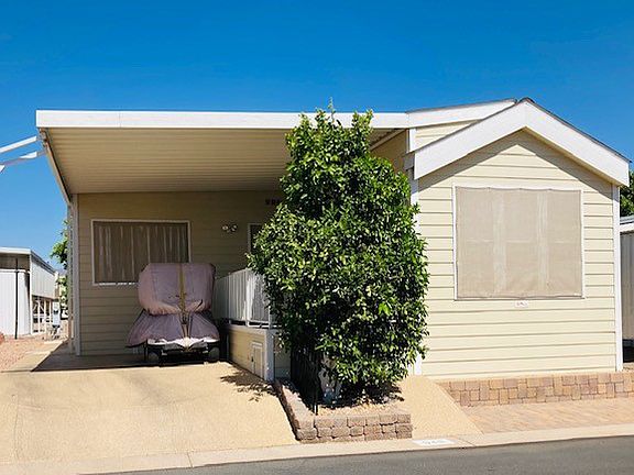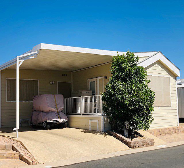 PET SECTION! Newer home with many upgrades and extras including golf cart! Attractive epoxy drive and large Trex deck welcome you to this elegant home the minute you arrive. Enter through the French door into the raised AZ room and find a comfortable living room complete with TV and recliners. Convenient 1/2 bath and laundry area is attached, with more storage than you can imagine! The back door takes you to a small back patio with pavers and plenty of room to grill those steaks. A large storage shed, grill, and water softener all all included with the sale of this home. The open and spacious kitchen and dining combo even has an office set up complete with printer. Large kitchen pantry, coat closet, and linen closet in the bathroom provide all the storage you'll need for your winter or year round home. Located at Superstition Sunrise, one of Arizona's most popular and beloved RV resorts, we have a wide array of amenities and activities for you to enjoy. Come join the fun! Call us to see this beautiful home today.