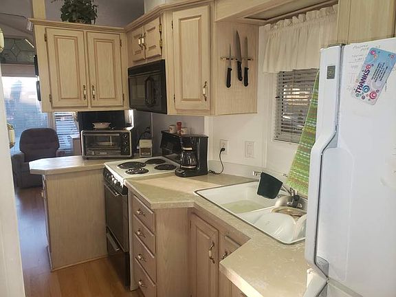 Welcome home to Superstition Sunrise where the fun never sets! This bright and open home offers a raised AZ room with beautiful wood laminate floors through out. The AZ room opens up to the hall way that leads you to the master bedroom with plenty of storage and the spacious bathroom. A large kitchen with tons of storage and counter space. The breakfast nook offers a coffee bar and more storage. A bright open living room that leads you to the lovely front raised patio. Come on by as this home wont last!