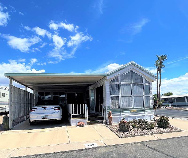 Welcome to Superstition Sunrise where the ""fun"" never sets! This home is surrounded by mountain views in beautiful Apache Junction Arizona in a premiere 55+ community with almost every amenity you can imagine! This well kept home is located on a premium corner lot that has space for additional parking along with a party deck to enjoy your morning or evening beverage. The U shaped kitchen has lots of cabinets for storage and spacious countertops. A ""forever roof"" was installed 5 years ago. Also, the home has a new water main line with cut-offs, a new steel back door & double pane window. This home has window sunscreens and solar tinted windows as well as a shade screen for the driveway! The raised AZ room provides lots of extra living space and storage. This move-in ready home awaits it's new owner!