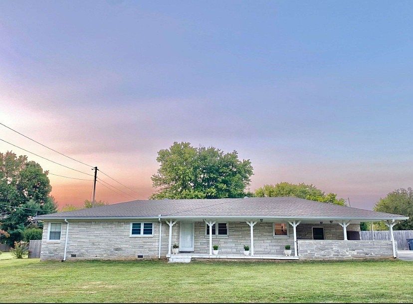 Large stone home on corner lot. Spacious single-level living. 3 bed, 2 1/2 bath. Hardwood/tile throughout. Custom kitchen cabinets with quartz, whirlpool black stainless appliances, and gas range. Formal dining room. Oversized laundry/mud room with Kohler sink, granite folding table, gas dryer, and designated space for an upright/chest freezer. Living room features a stunning stone fireplace with gas logs and ceiling beams for a cozy feel with a spacious layout. Master bedroom with on-suite double vanity bathroom. Enjoy the unique sunroom boasting large cut, marble flooring with an adjacent screened-in porch. Or unwind on the rocking chair front porch. Office features its own outdoor entrance with 1/2 bath for crafting, man cave, business, or work from home capabilities. 2 car attached carport. Detached 1 car garage with workshop area and separate drive. Ample parking and storage. Fully privacy fenced backyard with large mature tree. Whether you’re relaxing at home or entertaining family and friends, with over 2,900 sq ft, this sprawling stone rancher offers the perfect balance of charm, comfort, and functionality. *See links for a detailed virtual floor plan.