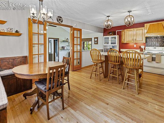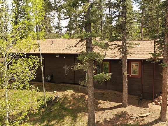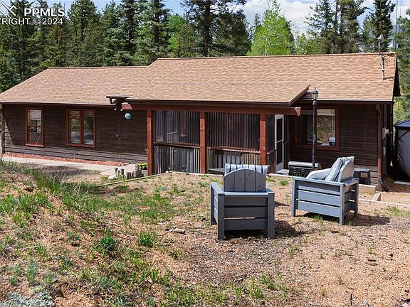 Welcome to the rustic double suite mountain cabin you've been searching for! Located in the popular Spring Valley neighborhood, this charming retreat sits on a spacious one-acre wooded lot, offering a serene escape with modern conveniences. Inside, you'll find solid oak flooring leading to the kitchen and dining areas. The 12x14 kitchen features maple cabinets and an island with a breakfast bar. Adjacent to the kitchen is the 10x12 dining area, perfect for family meals and gatherings. Stepping down from the dining is the carpeted 10x19 living room with vaulted ceilings and a freestanding wood pellet fireplace, creating a cozy atmosphere. Adjacent to the living room is the master suite, featuring a 12x14 master bedroom with carpet flooring, vaulted ceilings, and an ample closet. The en-suite master full bathroom is 5x8. At the opposite end of the home is the guest suite. The 11x12 guest bedroom also includes a 6x8 en-suite full bath. Adjacent is the 8x9 laundry room equipped with a washer and dryer. A new Rinnai on-demand water heater ensures efficient hot water supply. Recent updates include New refrigerator, ceiling fans and toilets in 2021; New sink & faucet and range hood in 2022; New dishwasher, natural gas service and water heater in 2023 and a New ridge vent in 2024. The one-acre wooded lot includes a fabric gazebo and a storage building for added convenience. There is ample paved parking and a paved driveway, providing easy access and plenty of space for vehicles. The property is frequented by abundant wildlife, offering a true mountain living experience. The Spring Valley community features multiple lakes, hiking trails, and a community center. Nearby Teller County offers numerous opportunities for hiking, biking, fishing, hunting, and OHV activities. This rustic double suite mountain cabin combines the tranquility of nature with modern comforts, making it the perfect retreat for those seeking a blend of adventure and relaxation.