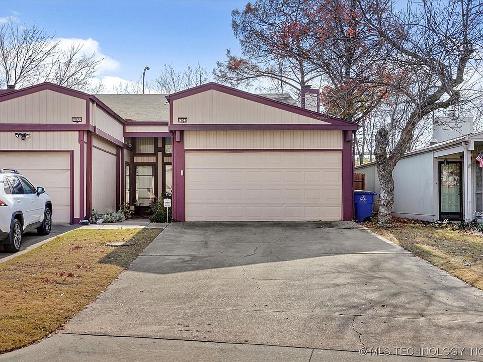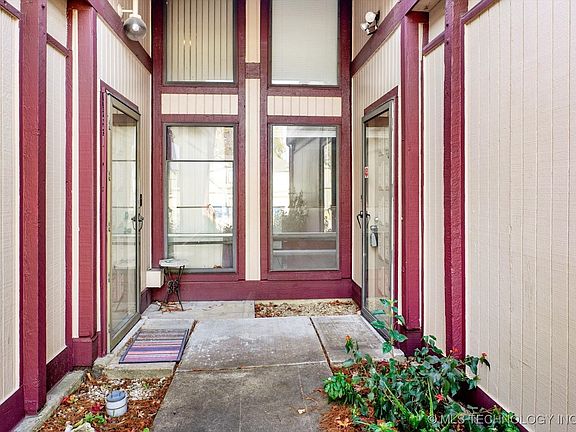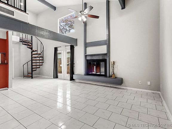Introducing this unique 2 Bed, 2 Bath condo filled with minimalist charm and contemporary design! Stunning living room includes a soaring 2-story vaulted ceiling with exposed beams, a striking spiral staircase, and abundant natural light. New tile flooring throughout living room, dining area, and kitchen. Wood-burning fireplace in the living room. The main-level primary suite offers convenience and comfort with a spacious walk-in closet. Upstairs, an open loft area overlooking the main living space offers flexibility as a den, home office, or potential third bedroom. The backyard is fully fenced and has a private patio and storage sheds. 2 car garage! This community shines with amenities, including a clubhouse, pool, and tennis courts. Conveniently located near everything Tulsa has to offer. Don't miss out on this one!