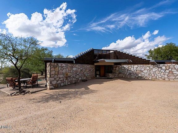 This incredibly unique Frank Lloyd Wright-inspired home will wow you with how cool it is. Stone & glass walls bring the outdoors inside w/stunning mountain & desert views all around on this 2.1 acre property. 4 beds & 2 baths w/updates throughout such as newer wood-look tile, white cabinets, SS appliances, & quartz counters make this modern home look brand new. Outside features a 3-stall mare motel, 2 stall barn with tack room, arena, an 8 person heated spa, & direct access to massive wash for horse riding. Close to downtown Cave Creek/Carefree but totally off any busy roads so extremely quiet, private area w/amazing views. This is a very rare offering & can be combined with 7018 E. Arroyo for the ultimate equestrian estate.