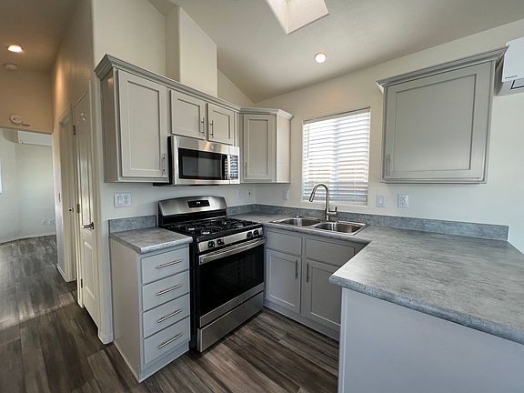 This Classic Casita getaway features a U-shaped style kitchen with upgraded stainless steel appliances, grey cabinets, washer & dryer ready, and wood-mimicking flooring. It also has plenty of storage and a built-in desk! It's conveniently located near the pickleball courts! Home Features: -Upgraded stainless steel appliances -Built-in desk -Large Living Room windows -One bed, one bath Want to take a tour or buy this home? Let us know!