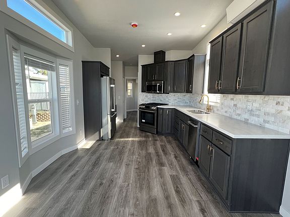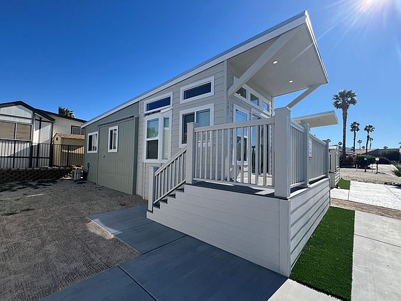 This Wedge Home is a move-in-ready home that is located on a desert edge lot with gorgeous mountain views! This getaway is our popular Wedge Model home with its distinctive front porch! We went all-out with the gold-accent kitchen and high-end appliances, striking dark cabinets, and white solid-surface countertops. Add on the gorgeous wood-look flooring and you have a gorgeous home that is brimming with personality. This is a sleek, modern-looking home with tons of storage and a built-in desk! Home Features: -One Bed, One Bath -Large living room windows -Upgraded appliances -Luxe kitchen appointments -Ceiling fans -Built-in desk Want to take a tour or buy this home? Let us know! Enjoy being part of a community that focuses on health and makes having fun a priority!
