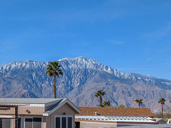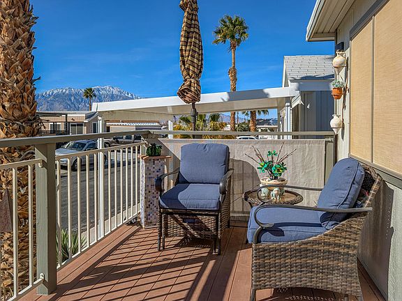 Enjoy sweeping, stunning views of San Jacinto from the front deck of this gem boasting 1+ bedrooms, 1.5 bathrooms and ~ 700 sq. ft. of beautifully maintained living space in this 2002 Fleetwood Park. The home is all on one level, featuring new hardwood floors throughout, which reflect the obvious pride of ownership. The California room is a highlight, with Gyprock walls adding to the home's well-insulated structure and is equipped with a Murphy bed, and doubles as a sleeping and bonus room. This home is a splendid example of meticulous care and thoughtful upgrades, providing both comfort and style in a serene setting and all the comforts of a traditional home with crown moulding for a touch of elegance, a private laundry area inside for added convenience, a fully functional kitchen including a center island, an oversized refrigerator, a built-in dishwasher and much more. The roof is new and comes with a 15 year transferable warranty. Discover your new home here at Caliente Springs, a prestigious 55+ Resort offering spectacular amenities to soothe your soul including hot mineral fed pool and spas, 9-hole golf course, 8-pickleball courts, tennis courts and fitness center. Lot is not owned; space rent is $671. Easy lender finance (OAC).