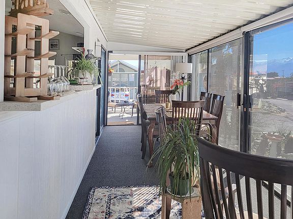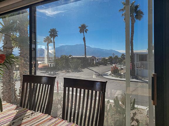 Incredible and unobstructed views in this beautiful Sundowner Park Model featuring 2 bedrooms (1 king and 1 queen), 1 bath with dual sinks, laundry room, upgrades throughout including kitchen countertops, new flooring, new dishwasher and stove/range with all furnishings inside and outside staying. Stunning large covered deck with spectacular views of Mt. San Jacinto and San Gorgonio Mountains where you can enjoy your morning coffee or unmatched sunsets. Located in the luxurious 55+ Caliente Springs Resort which offers amenities that include mineral hot spring pool and spas, state of the art fitness center, 9-hole golf course, pickleball court, tennis court, laundry facilities, library and fun organized community events. Come make this your new home or getaway place and enjoy this amazing community, this one will not last. Park approval required prior to purchase. Space rent $735