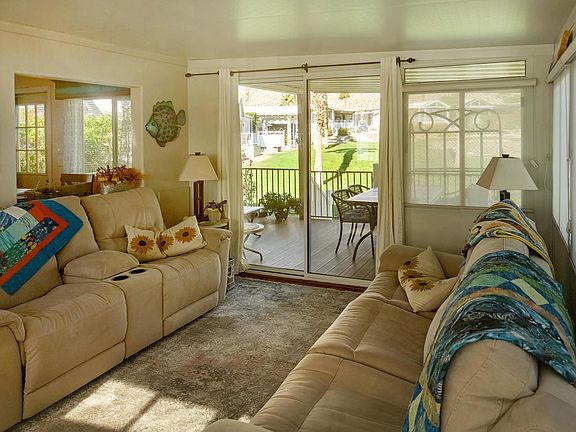 Magnificent jewel situated on the lush 8th hole of the golf course with spectacular views of the desert hills and tranquil pond. This efficient and well maintained 2007 Laurel Creek Park Model home with ~550 sq. ft., 1 bed, 1 bath has all the beauty and open functional features of a traditional home. Watch the golfers and wildlife from your gorgeous, covered deck and patio with lovely mature landscaping. This great home is nestled in the exquisite 55+ Caliente Springs Resort and steps away from the Clubhouse and all the amenities including mineral hot spring pools/spas, gym, library, chapel service, 9-hole golf course, 8-pickleball courts, tennis courts, and so much more. This is a must see! Lot is not owned; space rent is $905/mo.