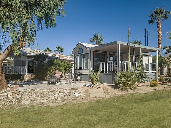 Pride in ownership and well sought after location high above the 5th/6th hole of the golf course. Sweeping and unobstructed views of Mt. San Jacinto. Come find your vacation getaway to the sun and desert with this immaculate, efficient, and well maintained 1998 Skyline Park Model features ~400 sq. ft. 1 bedroom, 1 bath, large HVAC system, newer roof, and volume ceilings. Sunbathe on your patio or on the covered deck and take in all the magnificent beauty. This jewel is in the luxurious Caliente Springs 55+ Resort and offers top notch amenities to soothe your every desire including mineral hot spring fed pool and spas, fitness center, 9-hole golf course, 8-pickleball courts, tennis courts, full laundry facilities, library, chapel services all in a fun and active community. Bring offers, make new friends, and call this home. Lot is not owned; space rent is $905.