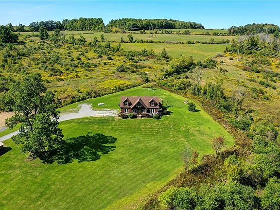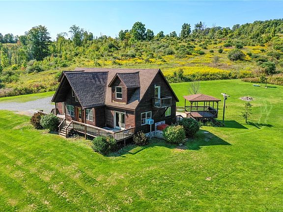 Don't miss this gorgeous timber frame construction home on 19 acres in an exceptional country setting with breathtaking views. This 3 bedroom, 2 full bath home includes an open living concept on the 1st floor w/living room w/propane fireplace, dining and a spacious kitchen w/stainless appliances; 1st floor owners suite; in floor radiant heat. 2nd floor features 2 bedrooms & a balcony area for office/den space. Full basement is poured concrete w/spray foam insulation; partially finished w/laundry and workshop. It has so much potential! Roof, driveway, high efficiency boiler/hot water combo new in 2020. Outbuilding had new metal roof and siding 2021. Flooring (Ceramic porcelain tile) was new in 2017. High speed internet and good cell service. The perfect getaway for a year round home, 2nd home, or potential investment property. Close to I-86 and I-390 allowing easy access to Corning, Rochester, Keuka Lake and beyond.