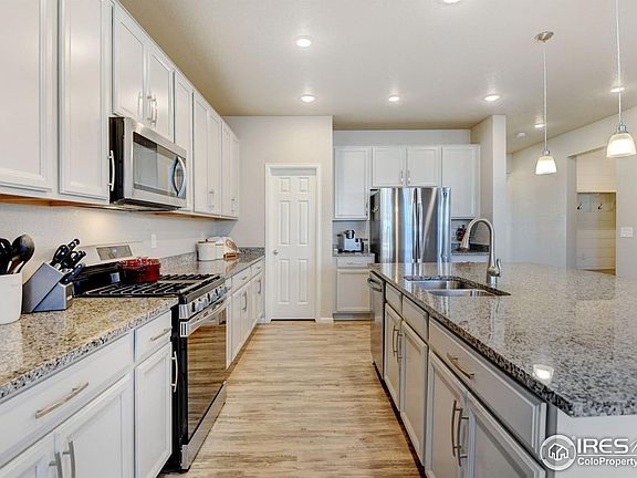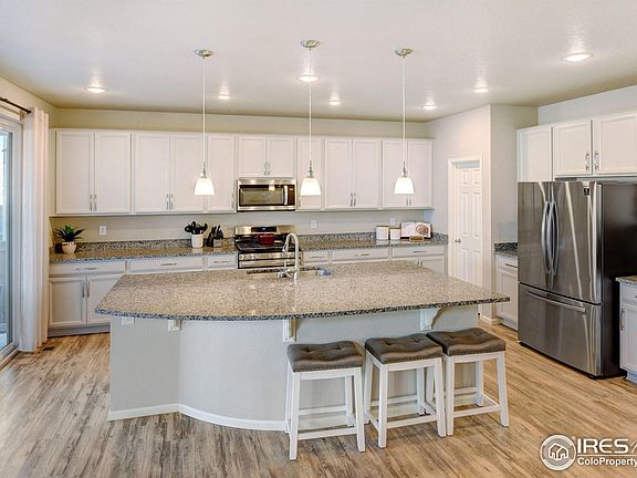 Enjoy comfortable Colorado living in this lovely 3 bedroom 3 bath Meritage home. Upon entering, your guests are welcomed with a traditional living room and guest powder bath. The luxury vinyl flooring leads into the grand open main living area and continues throughout the main level. This includes the chef's kitchen complete with slab granite counters, upgraded cabinetry and hardware plus quality stainless steel appliances. Plenty of cabinetry and a large pantry provides ample storage. The oversized island provides views of the family room and dining room. In the family room the stunning vaulted ceilings and ample windows allow wonderful natural light to cascade into the home. Completing the main floor is an inviting family drop station just off the garage entrance with cubbies and hooks for easy organization. Upstairs is equally as inviting with the large owner's suite with dual walk -in closets and completely upgraded spa-like bath. Additionally, you will find 2 secondary bedrooms with an upgraded jack-N-Jill bathroom, oversized loft and dedicated laundry room. The backyard is a perfect spot to enjoy the outdoors whether it is on the covered patio or cuddled around the gas fire pit. Raised planter beds have blueberries, strawberries and raspberries plus room to add your favorite veggis. Welcome Home.