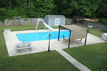 Enormous 3 bedroom/4 bath home with a bonus room & an in-ground pool! Gorgeous home with great bones that could be perfect. Plenty of space for all your family & friends. Large covered front porch. Attached double car garage. Extra room downstairs that could be used as a second living room, an office, a sitting area, or a game/play room for the kids. Charming kitchen with stainless steel appliances, a duo door oven, & a kitchen nook with a bay window. Formal dining room with built-in shelving. Large living room with carpet & a fireplace. Master bedroom with built-in storage & a master bath with two vanities, one with a spot to get ready at, & a walk-in closet with shelves. Second bedroom with vaulted ceilings & an attached half bath & closet space in the bathroom. Bonus room with an additional sitting area included. Spacious backyard with a privacy fence, two sheds for plenty of storage, a cute tree-house style hangout, a firepit, & an in-ground pool with a slide!