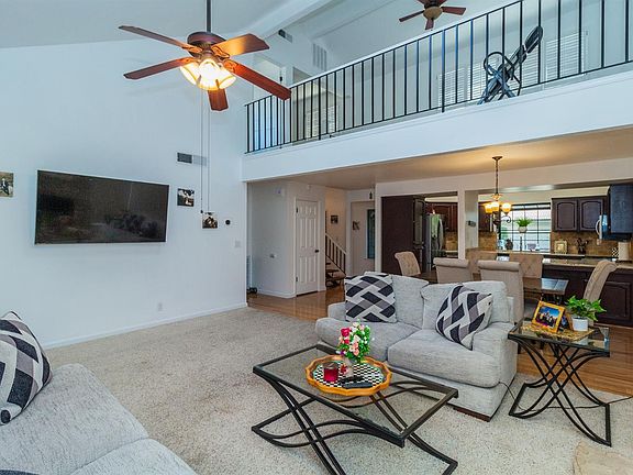Northridge Terrace gated PUD located in NW Fresno and Clovis Unified School District has a total of 75 units in the complex. This updated 2 bed 2.5 bath has an open floor plan with vaulted ceilings, floor to ceiling rock fireplace in great room. The kitchen has granite counter tops with a tile backsplash, tile flooring, eating bar, greenhouse window. The spacious master bedroom is located on the lower level with an updated bath with granite countertops, huge walk-in shower and closet. Upstairs has a very large loft with a guest bedroom and and bathroom. Ring Cameras, Nest Thermostat, and almost new refrigerator included. HOA includes water, sewer, garbage.