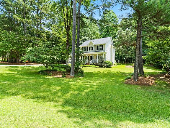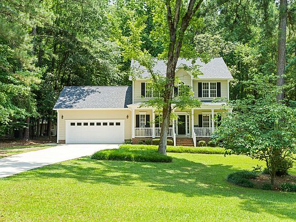 Welcome home to this beautiful property conveniently located in Southern Wake County! Enjoy mornings on your rocking chair front porch and entertaining on the spacious new deck overlooking the lovely landscaped, private backyard! Other features include hardwood flooring throughout the first floor, separate dining room that could function as a home office, eat-in kitchen, living room with fireplace, plush new Stainmaster carpet throughout the second floor as well as the stairs, spacious primary suite with walk-in closet, two secondary bedrooms with ample closet space, and don't miss the unfinished storage area above the garage! Plus, a two-car garage and durable fiber cement siding!