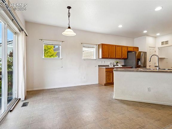 Discover main-level living in this spacious 3,400+ sq. ft. ranch home nestled in the desirable Cross Creek neighborhood. This beautifully landscaped property features no-maintenance front and back yards, complete with mature trees and fruit trees (peach, cherry, and apple), a storage shed, and a large composite deck that spans the back. Enjoy various outdoor seating areas, from the covered front porch to multiple patios in the backyard. Inside, you’ll find soaring vaulted ceilings and two generously sized bedrooms alongside a full bathroom at the front. The heart of the home boasts a bright and inviting living room, highlighted by a cozy gas fireplace, built-in storage, and high ceilings. The kitchen features an eat-in area with access to the covered deck, abundant cabinets for storage, ample counter space, and a breakfast bar for extra seating. Stainless steel appliances and a pantry are included, while the main-level laundry room is conveniently located near the two-car garage. The primary suite on the main level offers vaulted ceilings, an attached bath with a double sink vanity, walk-in shower, jetted soaking tub, and a walk-in closet. The finished walk-out basement provides a private entry and can serve as an independent living space. It includes a spacious family room with a built-in entertainment center, a kitchenette with a wet bar, and a large secondary bedroom with double closets and an attached full bathroom accessible from the hallway. An additional secondary bedroom features a walk-in closet and built-in shelves, along with a large storage room/flex space and under-stair storage. Other highlights include a new roof and exterior paint (2018), a water heater (2016), and a security system. Located in a well-maintained community with low HOA fees, this home is just minutes from shopping, dining, Fort Carson, and I-25. Don't miss your chance to own this beautiful property!
