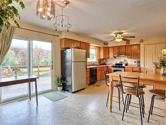Breathtaking northerly views abound here. Sliders in kit and MBR to multi-tiered decking which is ideal for entertaining/star gazing/etc. Oversized eat in kit w/pantry and newer appliances. MBR with 2 closets (1 is WIC) and full bath. Four season sunroom, wood stove, main level laundry. Oversized two car gar, covered front porch, koi pond. Fishing Creek runs through wooded area on lower end of property. Quietude redefined.