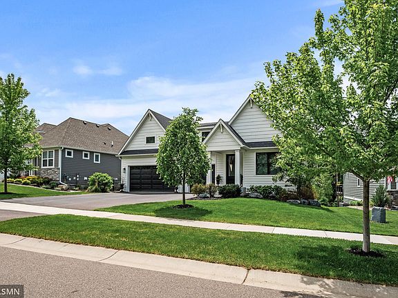 Step into timeless elegance with this stunning walkout rambler by Stonegate Builders, perfectly nestled in the sought-after community of Cottage Grove. From the moment you arrive, the modern farmhouse charm will capture your heart – featuring crisp white LP SmartSide® siding, bold black-framed Anderson windows, and a lush, mature landscape that wraps beautifully around the property.