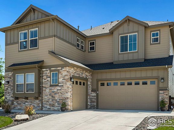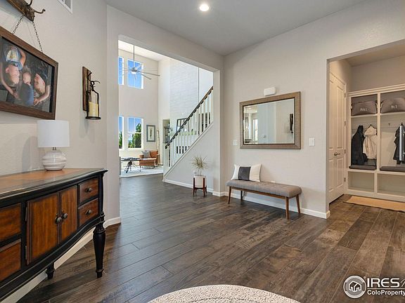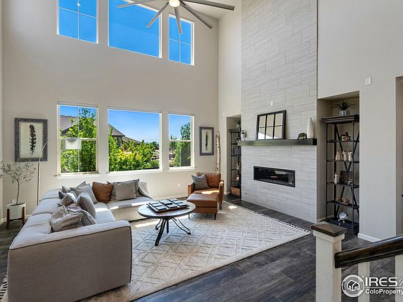Beautifully upgraded home with incredible mountain views in desirable Wildwing! Enjoy resort style living with the community pool just a short walk away! Other neighborhood amenities include Timnath Reservoir, community park and walking trails. Take advantage of the quiet cul-de-sac location by spending time on the expansive covered front porch. Chef's kitchen features an oversized island, double oven, gas cooktop, walk-in pantry and abundant counter and cabinet space including a butler's pantry. Upgraded wood look tile flooring throughout the main level living areas. Open floor plan with kitchen opening to living room with two-story high ceiling, fireplace wall and several windows that provide extensive natural light and snow capped mountain views. Flex room or office plus a junior suite with ensuite bathroom also on the main level. Upgraded lighting and fans have been installed throughout the home. Upper level primary suite with huge remodeled shower and custom closet with shelving and drawers. Two additional bedrooms, each with ensuite bathrooms, laundry room and spacious loft complete the upper level. Stay comfortable all year long with two furnaces and two air conditioners. Professionally landscaped backyard offers multi-tiered living spaces with covered patio plus paver patio, numerous trees and a spacious yard area. Generously sized .29 acre lot. 3 car garage with epoxy floor and plenty of storage space. Enormous unfinished basement perfect for fitness area, storage or future expansion. Take advantage of this opportunity to own your dream home in picturesque Wildwing on the shores of Timnath Reservoir!